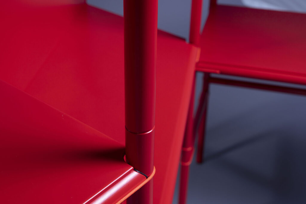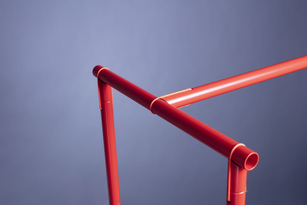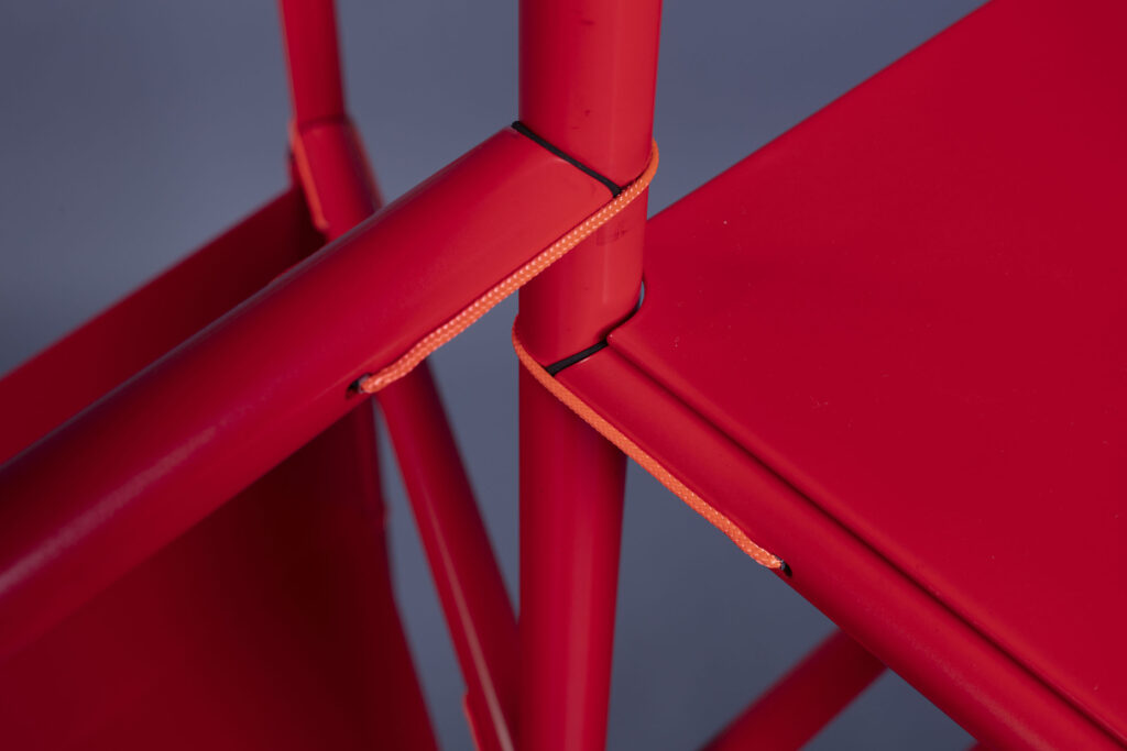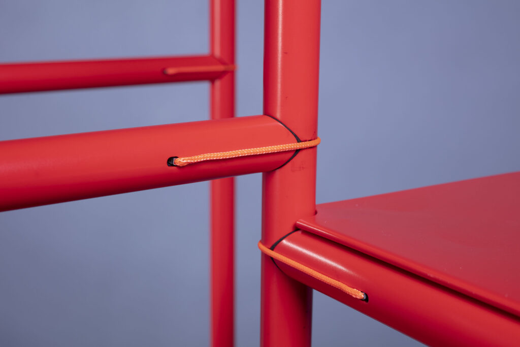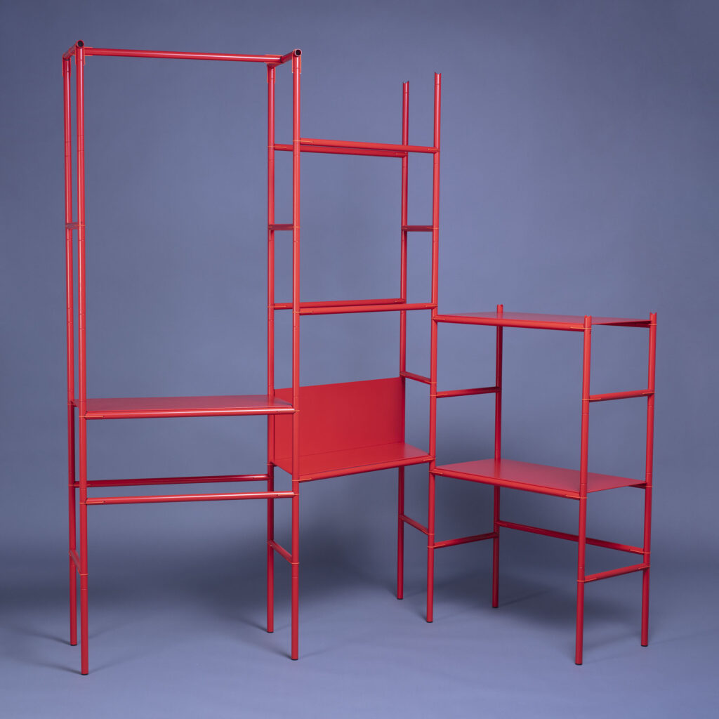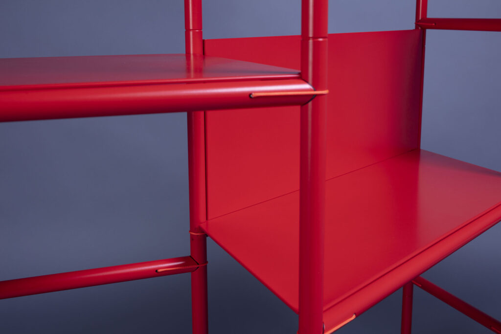 The system consists of shelves and tubular sections easily assembled by the user without tools. The ends of the tube sections are shaped to fit against each other and „lever“ into place, secured with short ties.